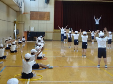 9月14日(火)朝から小雨が降って、2年生が運動会の団体演技の練習を体育館でしていました。