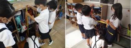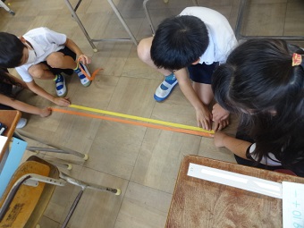 教室の中にあるロッカーとろうかにあるくつ入れロッカーの高さを比べるためにオレンジ色と黄色のテープを使って調べていました。テープをその高さでちぎって、2本並べて熱心に比べていました。