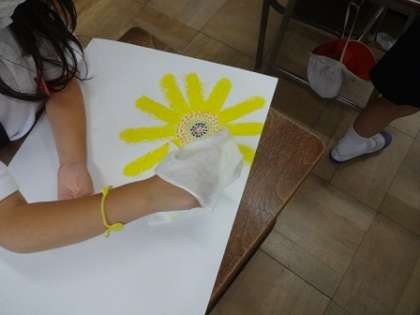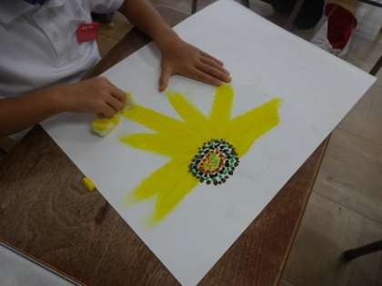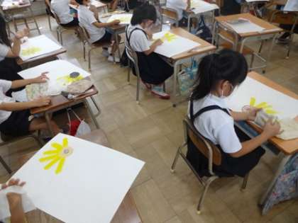 1年生が図工の時間にひまわりの絵をかいていました。黄色のクレパスを使い、力強く描いていました。完成が楽しみですね。