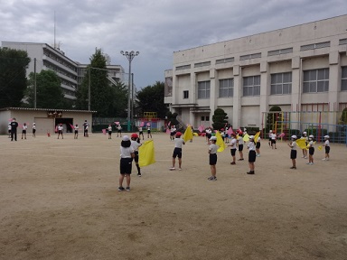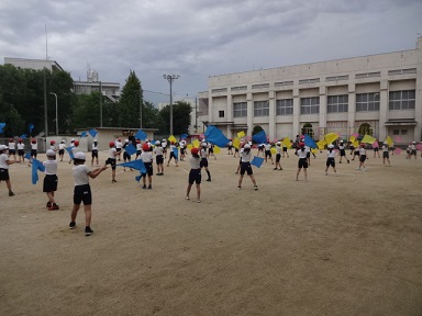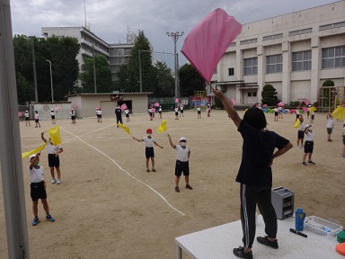 4年生が運動会でする団体演技の練習を運動場でしていました。ゲームのテーマ曲に合わせて、黄・青・ピンク色の旗を振りながら、一生懸命に演技をしていました。