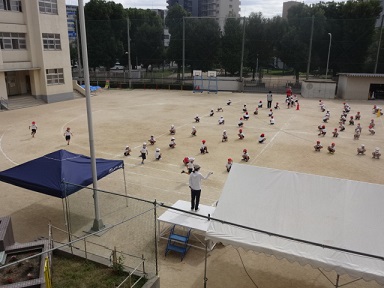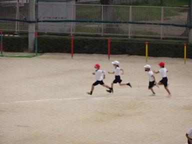 1年生が運動会でするかけっこの練習をしていました。大きなトラックを使い、勢いよくカーブを曲がるのはなかなか難しいですが、頑張っていました。