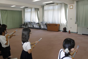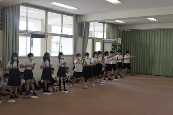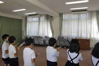 4年生が理科「空気でっぽう」の学習をしていました。プラスティックの筒の前後においた玉の位置を調整し、玉と玉の間の空気の量を変えて、空気圧によって飛び出す玉の勢いがどう違うのかを調べていました。