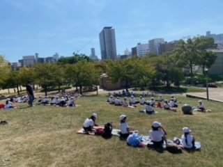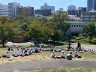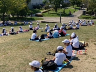 飛沫防止のため、向かい合わせにならないようできるだけ隣同士に並んで食べていました。