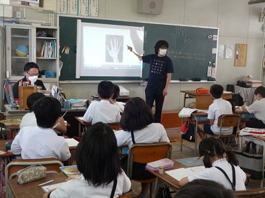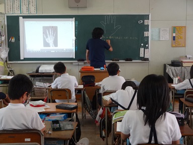 4年生が理科「体を曲げられるところ」の学習をしていました。手指や腕の関節の様子を知り、どのようにして曲げられるのかを学んでいました。