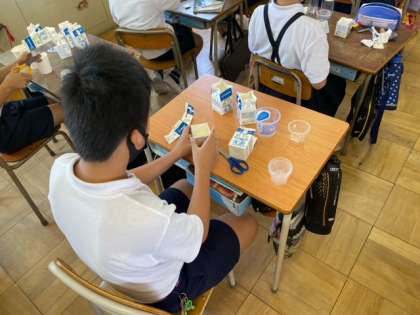 墨アートで筆を洗うためのバケツを牛乳パックを使って作成していました。