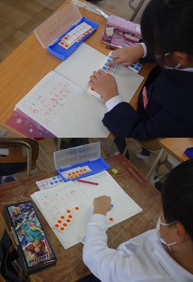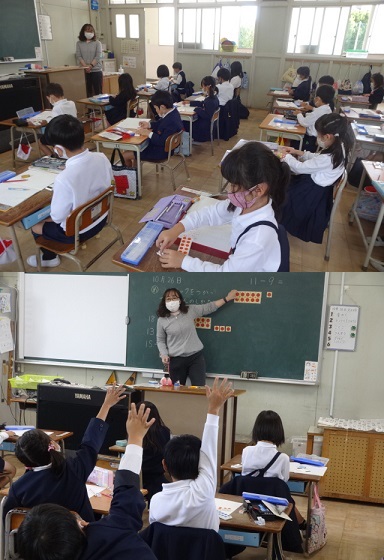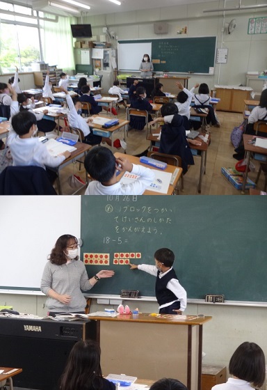 10月26日(火)1年生が算数科「ひきざん」の学習をしていました。「13−9」など繰り下がりのあるひき算の答えの求め方をブロックを使って考えていました。