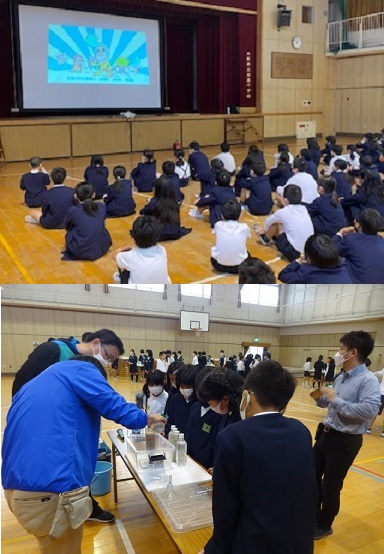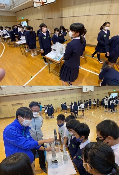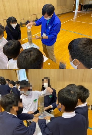 柴島浄水場の方が来られて、出前授業を行いました。淀川でとれた汚い水を 、ろ過を通じて、きれいにする方法を体験しました。透明な水になる様子に、子ども達はとても驚いていました。