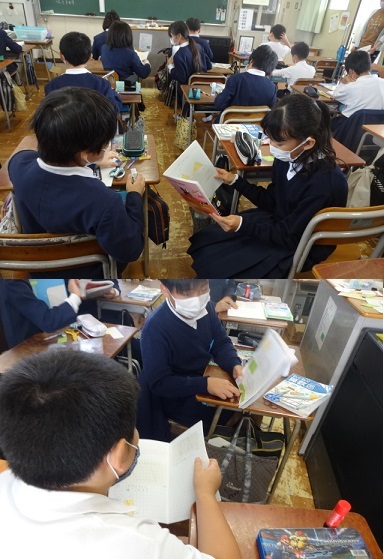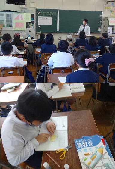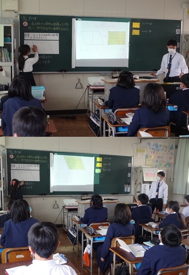5年生で算数科の研究授業が行われました。平行四辺形の面積の求め方について、既習の長方形や三角形の面積の求め方を使って考える学習でした。図形を切ったり、移動させたりして求めたものをグループで話し合い、発表していました。