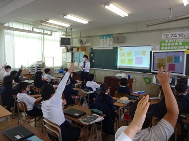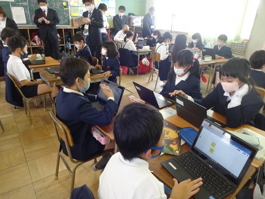 4年生が社会科「大阪府に伝わる祭りや行事」について取材した情報を、Jamboardに自身でまとめました。それをグループで見せ合い、効果的に伝えられるようなデジタルパンフレットに作り上げる話し合いをしていました。