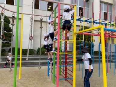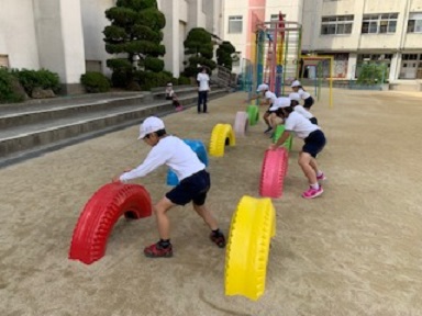 11月5日(金)2年生が体育科の学習で、ある場所から走ってきて、ジャングルジムやタイヤ、肋木など遊具に触れて、元の場所にもどる活動を楽しんでいました。