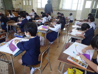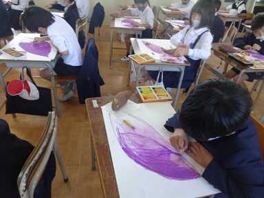 2年生が図画工作科の時間に、先日学習園で掘り出したおいもの絵を描いていました。紫色や茶色のパスを使って、おいもを画用紙のそばに置きながら、楽しそうに描いている子が多かったです。