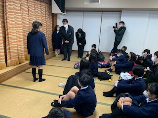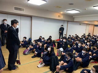 閉舎式を行いました。宿舎の方に感謝の言葉を言い、宿舎の方からはお褒めの言葉をいただき、ホテルをあとにしました。