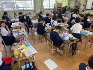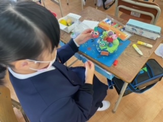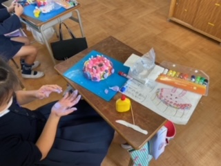 2年生は粘土でホールケーキを作っています。みんな楽しそうに自分なりのケーキを作っていました。