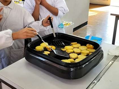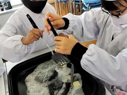 今日の1〜2時間目に2年3組が家庭科室でおいもパーティーをしていました。とっても美味しそうな香りとともに出来上がったさつまいものバター焼き。学習園で収穫できたさつまいもをおいしくいただきました。