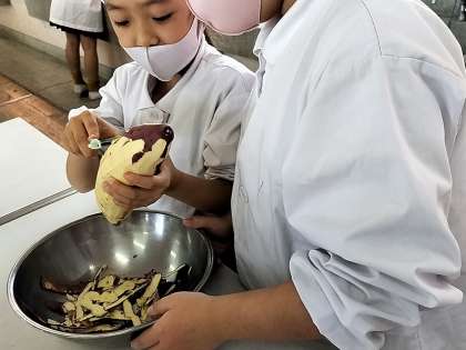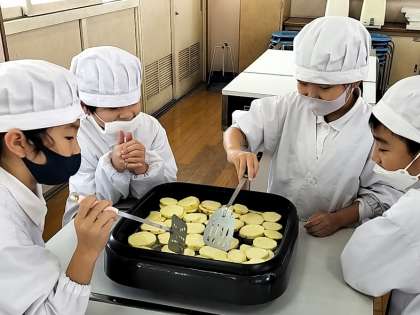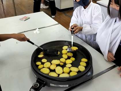 3〜4時間目は2年2組がおいもパーティーをしていました。初めて家庭科室を使っての作業で緊張しながらも、みんなで協力して取り組むことができていました。「すごくおいしい!」と笑顔で感想が聞けました。