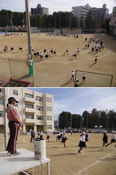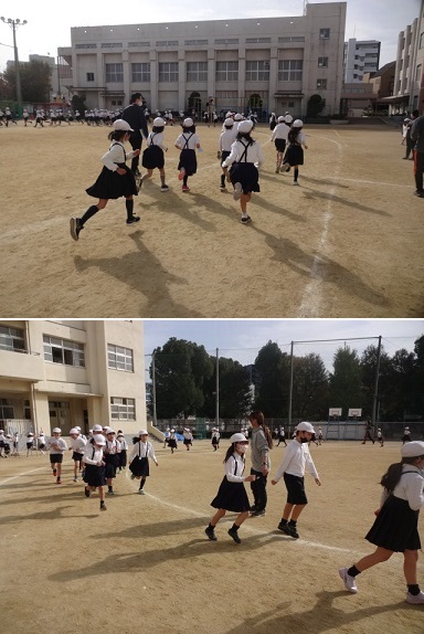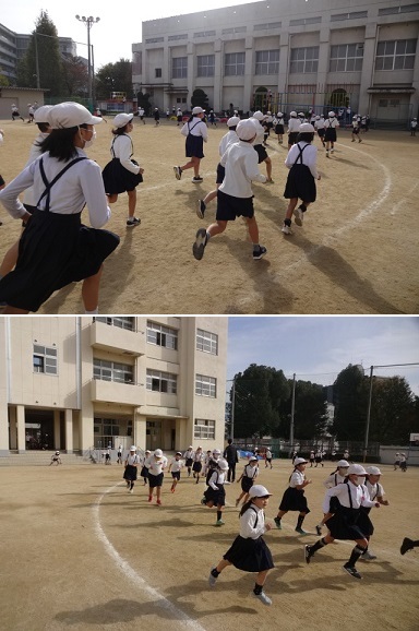 11月18日(木)2・3時間目の間の休み時間に、今日は3年生が運動場で走りました。最初は学級ごとの集団で同じペースで、その後は自分に合ったペースで走りました。