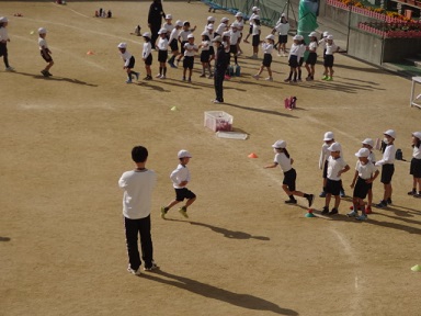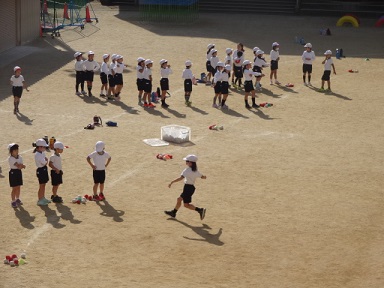 1年生が体育科の時間に、運動場で「リレーあそび」に取り組んでいました。チーム対抗で赤白だまを使って楽しんでいました。