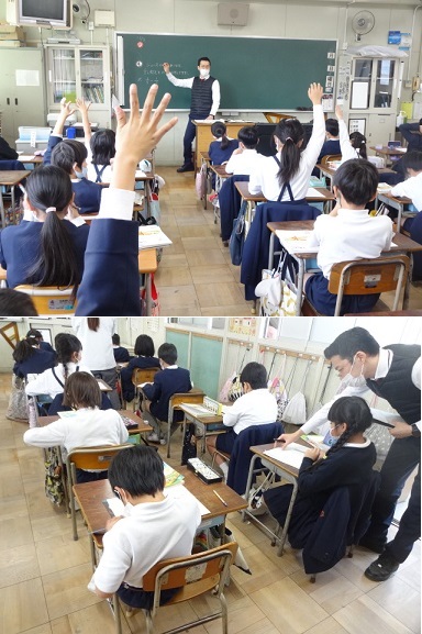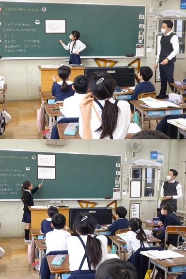 3年生が算数科「分数のひき算」の学習をしていました。同じ分母のひき算の仕方を自分で考え、友達を交流したり、前で発表したりして、楽しく集中して取り組んでいました。