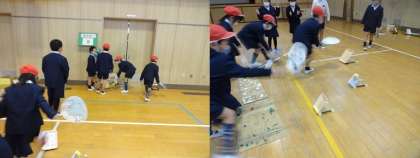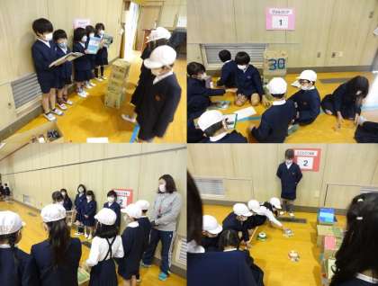 「おもちゃまつり」を1・2年生が講堂でしていました。2年生が生活科の時間に作った動くおもちゃを「ぴょんコップ」「とことこくるま」「ころころころん」「ロケットポン」「ヨットカー」の5つのコーナーに分かれ、1年生に説明し、遊んでもらいました。今日は1年3組と2年3組の交流でした。