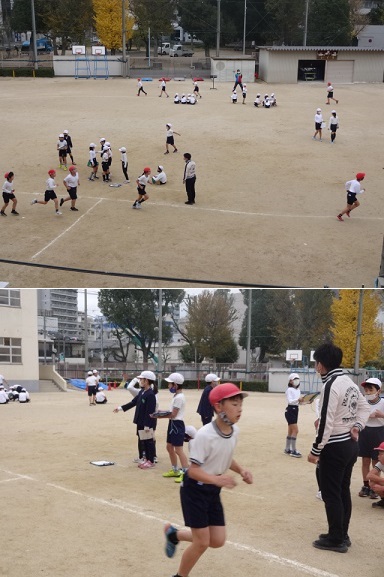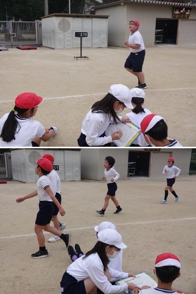 4年生が体育科の時間に、耐寒かけあしで記録を測定していました。運動場のトラック15周のタイムを測って、前に測定したタイムと比べていました。前より記録がよくなった子が多かったようです。練習の成果がありましたね。