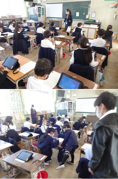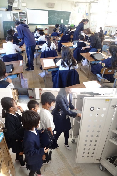1年生がタブレットの使い方に慣れるために、ICT支援員の先生にも入ってもらい、ログインやID・パスワードの入力の仕方、ログアウトなどの操作を楽しんでいました。