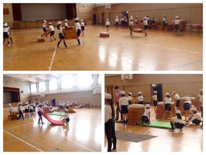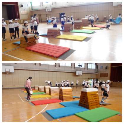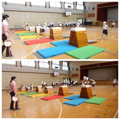 3年生が講堂で跳び箱の練習をしています。自分の課題に合わせて、開脚跳びの練習をしました。その後新しい技に挑戦しました。
