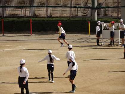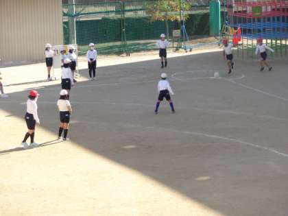 3年生が運動場でキックベースボールの試合をしています。6チームに分かれてリーグ戦を行っています。