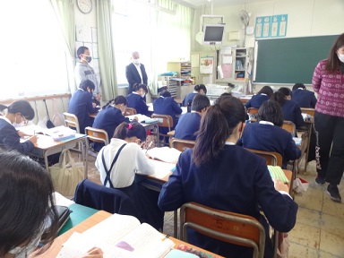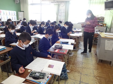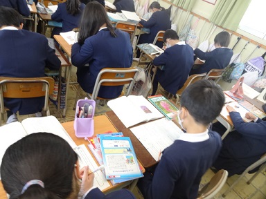 6年生が国語科の時間に、「ヒロシマのうた」の復習をしていました。中学校の先生も見に来られ、少し緊張しながら熱心に学習に取り組んでいました。