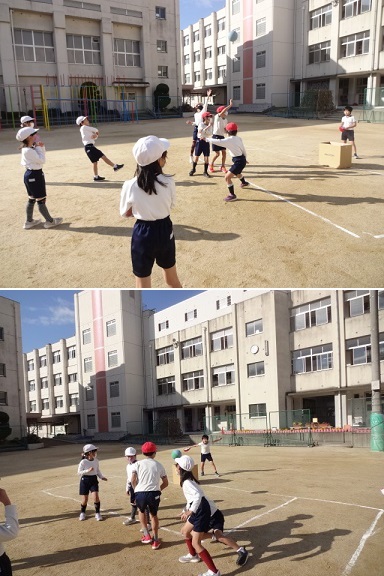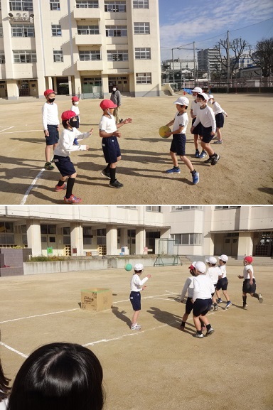 2年生が体育科「ボール投げゲーム」の学習をしていました。攻撃チームがダンボールでできた箱の中にシュートを入れて得点を競うゲームです。守備チームがそれを防ぎます。時間で攻守を交代します。みんな一生懸命にしていました。