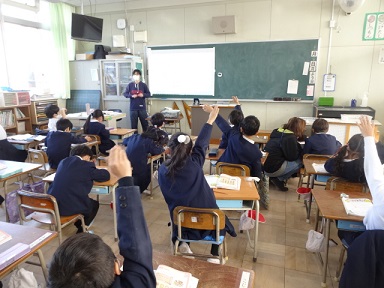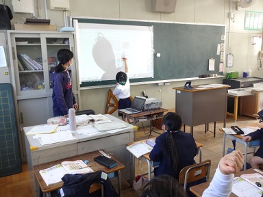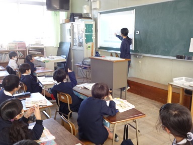 1年生が算数科「もののいち」の学習をしていました。ものの位置について,ある点を基準にして、前後,左右,上下などの言葉で表すことができるようになることがねらいです。絵で描かれた表をもとに、指示されたものを探し出していました。