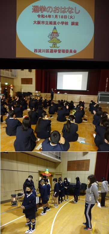 出前授業で選挙管理委員会の方に来ていただき、6年生が選挙について学びました。