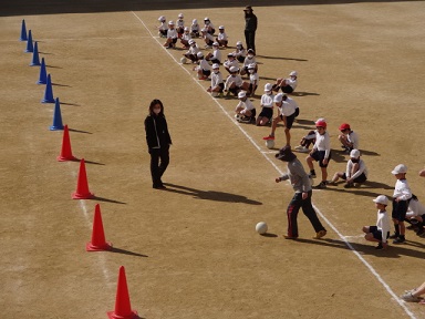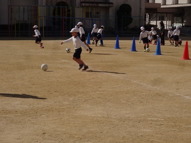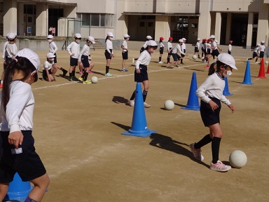 2年生が体育科「ボールけりゲーム」の学習を運動場でしていました。どの子も一生懸命にボールを足でコントロールし、ゴールを目指してシュートをしていました。