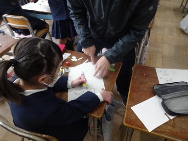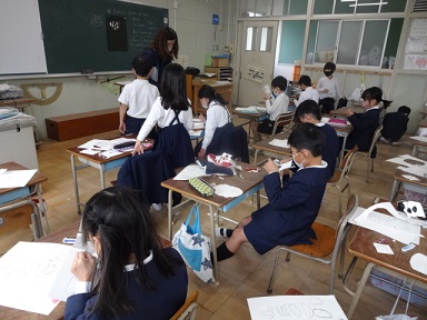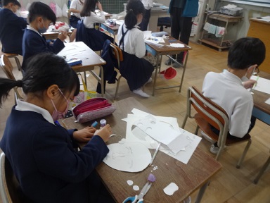 2年生が図画工作科の時間に、紙版画に取り組んでいました。画用紙に自分の顔の形を描き、目や鼻、口などを切って貼り付けていました。