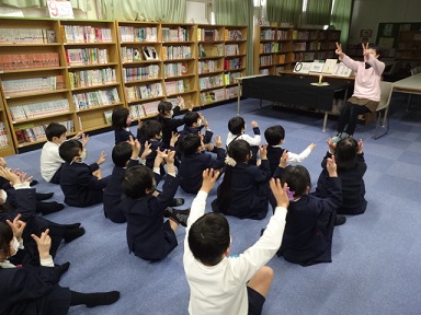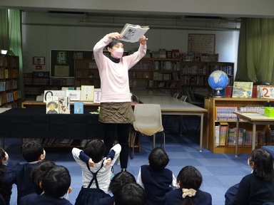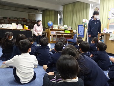 2月18日(金)1年生が読書の会で図書館補助員の方から物語のお話を聞いたり、リラックスの仕方を教えてもらったりしていました。
