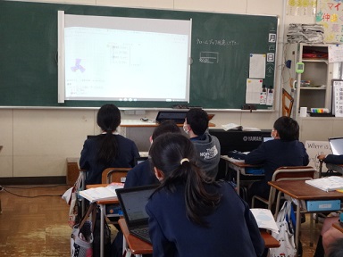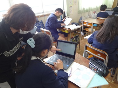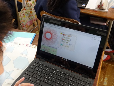 5年生が算数科の学習として、学習端末を使ってプログラミングを考え、図形を描いていました。いろいろな幾何学的な模様が出来上がっていました。