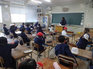 3月10日(木)今年度最後の児童集会がありました。感染予防のため、全校児童で集まることはできず、各教室で学級単位の集会となりました。放送を通じて、姫里小学校に関わるクイズに三択で紅白帽で答える方法での活動でした。クイズの後に集会委員一人ずつからの感想もありました。