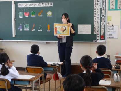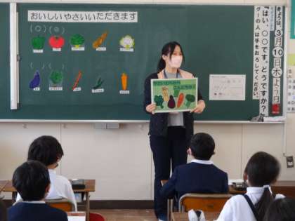 2年生が栄養指導で「おいしいやさいいただきます」の学習をしていました。野菜を食べないとどうなってしまうのか、紙芝居で確認しました。「野菜を食べて、かぜをひかない体をつくりたい」という感想を聞くことができました。
