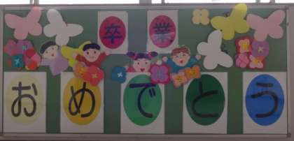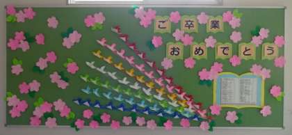 卒業式の練習が毎日行われていますが、学校の中の掲示物も卒業お祝い仕様になっています。写真は2階の中央階段前と、図書室前の掲示板です。