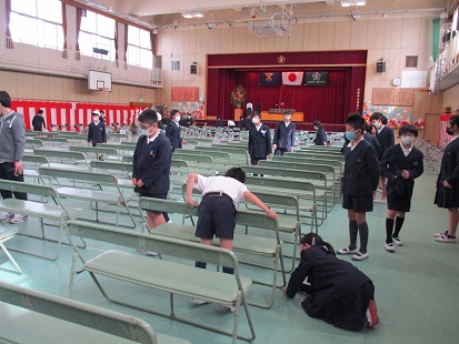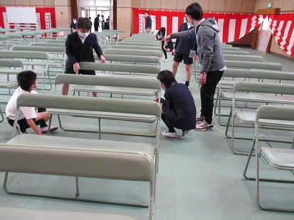 5年生が明日(3/18)の卒業式のため、熱心に会場の準備をしていました。明日も在校生代表として参加します。頑張りましょう!