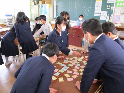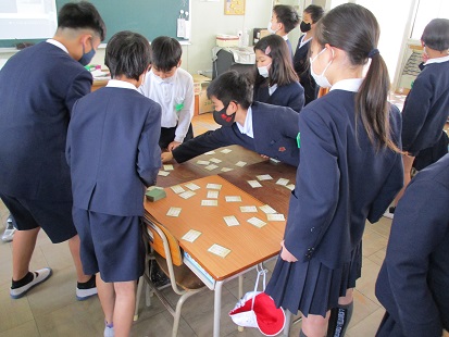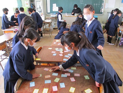 4年生が各クラス混合の百人一首大会をしていました。みんな真剣に札を取り合っていました。