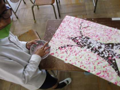 大きな木の幹と自分の絵の上に、指を使ってきれいな桜の花を咲かせていました。