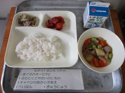 今日は1学期入って初めてお魚を使った献立でした。まぐろのオーロラ煮はお魚を使った献立の中でも人気の高いメニューです。下味をつけたまぐろにでん粉をまぶし、油で揚げてケチャップ、砂糖、赤みそで作ったたれを絡めて作っています。