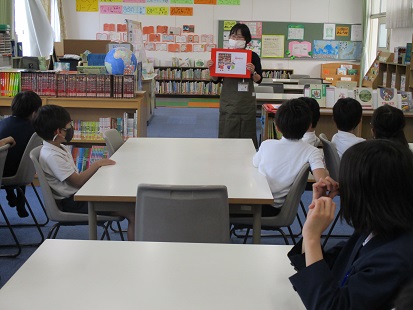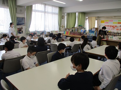3年生が図書館オリエンテーションで、学校司書の先生から図書室の使い方や本の扱い方などについて教えてもらいました。