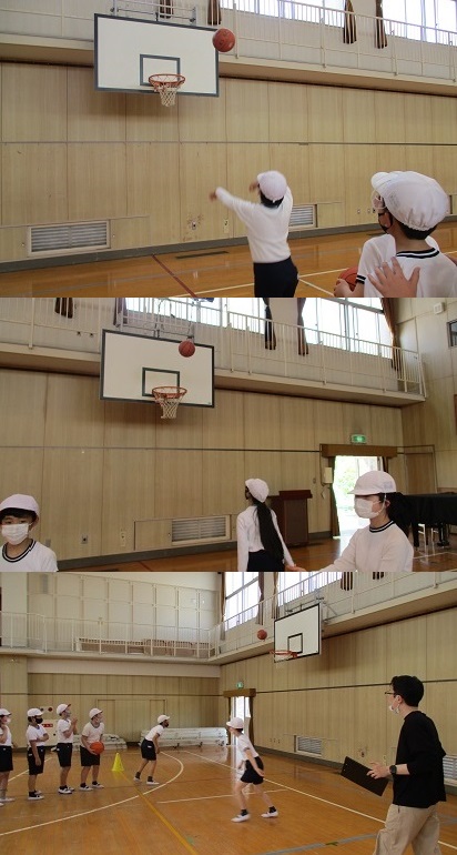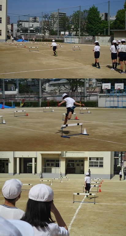 6年生が体育科の時間に、運動場で「ハードル走」、体育館で「バスケットボール」の学習をしていました。