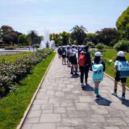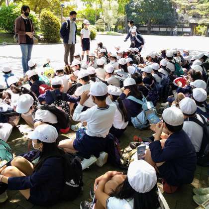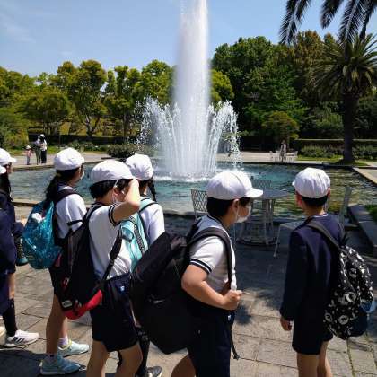 須磨離宮公園へ着きました。噴水前でクラスごとに写真を撮ります。