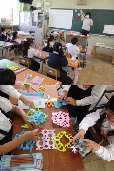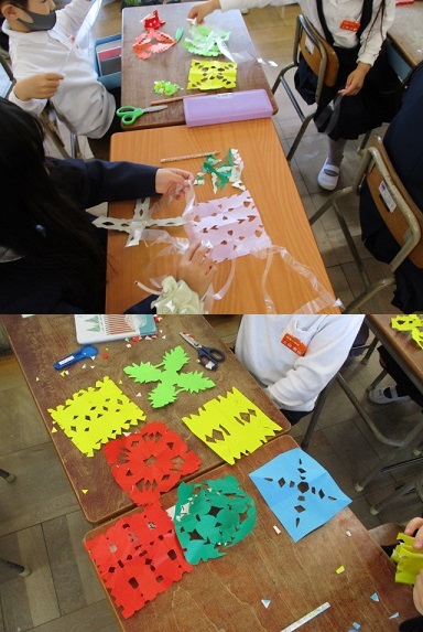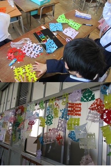 1年生が図画工作科「ちょきちょきかざり」の学習に取り組んでいました。色紙を折って、ハサミでいろいろな形に切り、開いた模様を楽しんでいました。最後に、テープにつけて窓に飾りました。