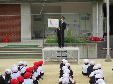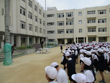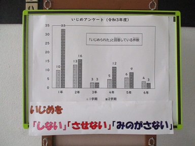 5月9日(月)今日は「いじめについて考える日」です。児童朝会では、いじめのお話をしました。昨年度のいじめアンケートの結果をもとに、いじめを「しない」「させない」「みのがさない」を目標に掲げ、人に対していやに思うことを言ったりしたりしないこと、思いやりの気持ちをもつことなどを話しました。