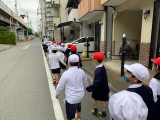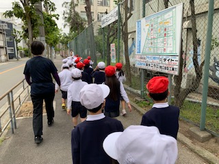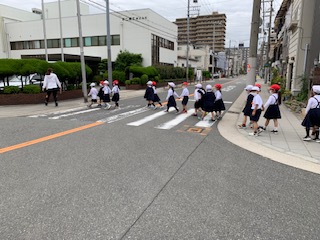 1年生が交通安全指導で、先生の引率のもと校区内を回りました。横断歩道の渡り方など教えてもらい、しっかりと学習できました。