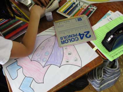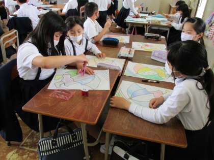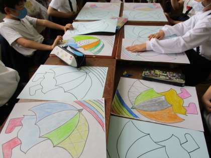かさやレインコート、ながぐつなどの色やデザインを考えています。下書きができたら、次は絵の具の練習をします。