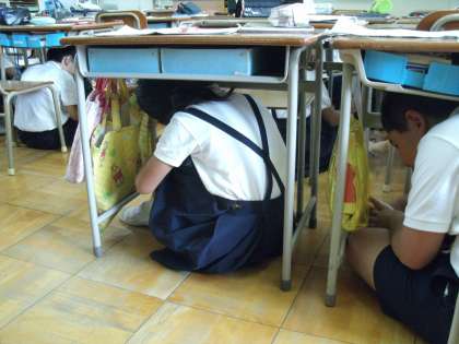 9月5日(木)11:00の訓練放送に合わせて、自分の身を守る行動をとる練習をしました。教室では机の下に潜り込む。水泳学習時はプールサイドにあがる。机のない教室では、窓側から離れ低い姿勢を保つ。など、1分程度行いました。5時限には災害時等を想定して、登校班別に集団下校をする練習をしました。